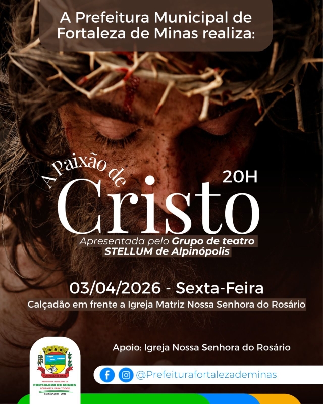 No dia 03/04/2026 (Sexta-feira Santa), às 20h, no calçadão em frente à Igreja Matriz Nossa Senhora do Rosário, o talentoso Grupo de Teatro Stellulum, de Alpinópolis, apresenta ‘A Paixão de Cristo’ – uma encenação emocionante que retrata o sacrifício e a ressurreição de Nosso Senhor Jesus Cristo.