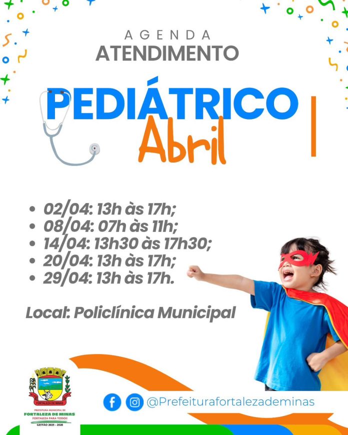 A Prefeitura de Fortaleza de Minas informa a agenda de atendimentos pediátricos na Policlínica Municipal durante o mês de abril: