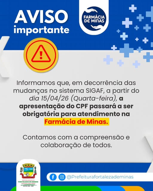 Informamos que, desde quarta-feira, 15/04/2026, devido às atualizações no sistema SIGAF, a apresentação do CPF passará a ser obrigatória para atendimento na Farmácia de Minas.