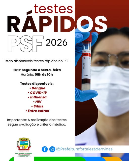 A Prefeitura Municipal, por meio da Secretaria de Saúde e PSF , informa que estão disponíveis testes rápidos no PSF.